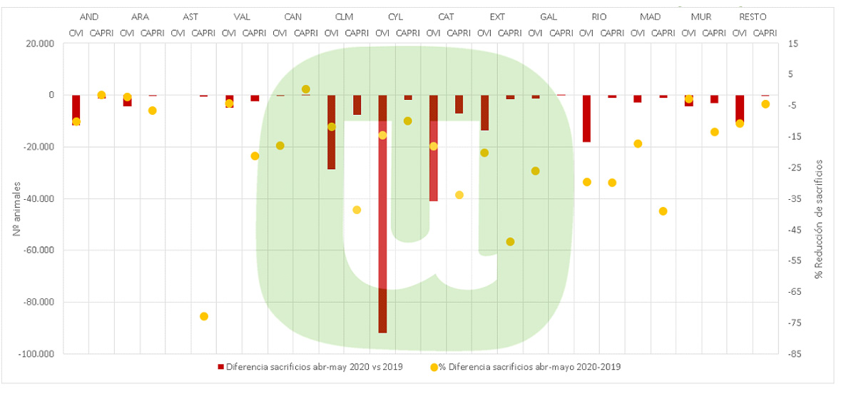 La organización recuerda el desplome en las producciones de abril y mayo, cuando los sacrificios cayeron de media un 12% para ovino y caprino. A nivel CCAA, la mayor reducción de sacrificios de ovino se dio en La Rioja (-29,7%), Galicia (-26,1%) y Extremadura (-20,1%), mientras que en caprino fueron Asturias (-72,8%), Extremadura (-48,8%) y Madrid (-39,1%). La reducción de sacrificios, además, se ha visto acompañada de fuertes caídas en los precios, tanto en ovino como en caprino, lo que pone contra las cuerdas a un sector clave en la España rural.