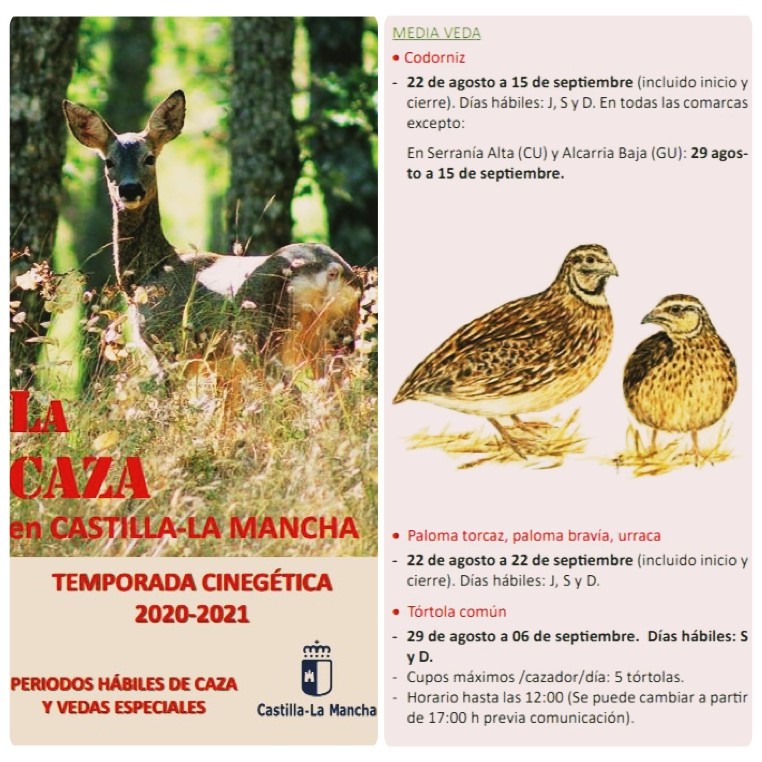La Consejería de Desarrollo Sostenible, a través de la Dirección General de Medio Natural y Biodiversidad, informa que este sábado 22 de agosto se ha abierto la ‘media veda’ en Castilla-La Mancha: un periodo especial en el que se autoriza la caza de las especies migratorias de carácter estival: paloma torcaz, codorniz y la tórtola común.
