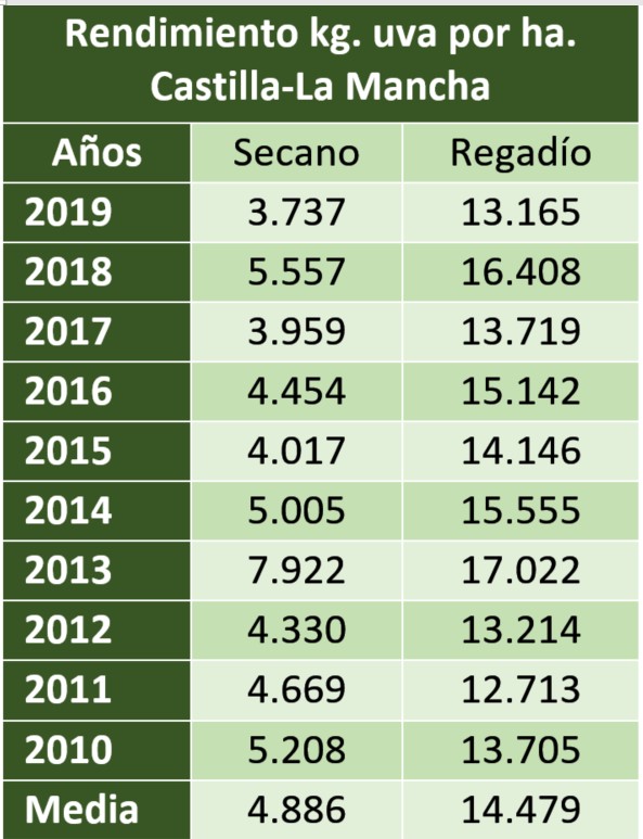 La media de este periodo de tiempo es de 4.886 kilos/hectárea para secano y 14.479 para regadío. En secano, el mejor año fue 2013, con 7.922 kilos/hectárea y el peor 2019, con 3.737. En cuanto al regadío, destaca la vendimia de 2013, con 17.022, siendo la más baja la de 2011, con 12.713.