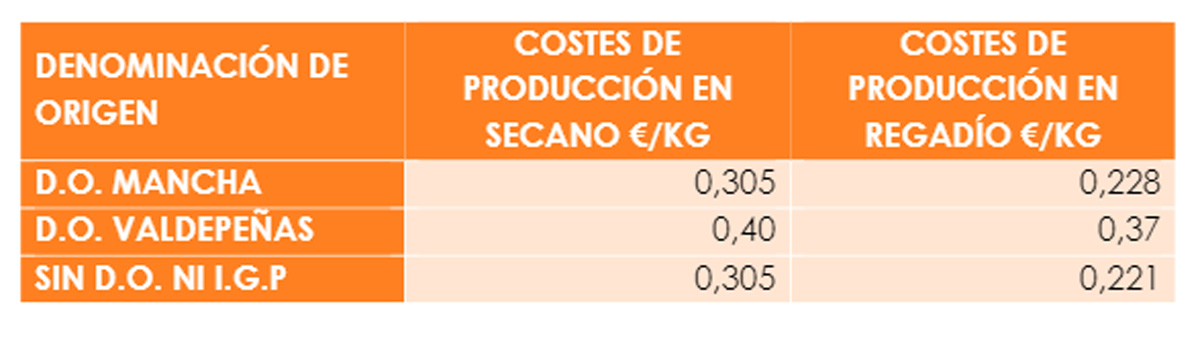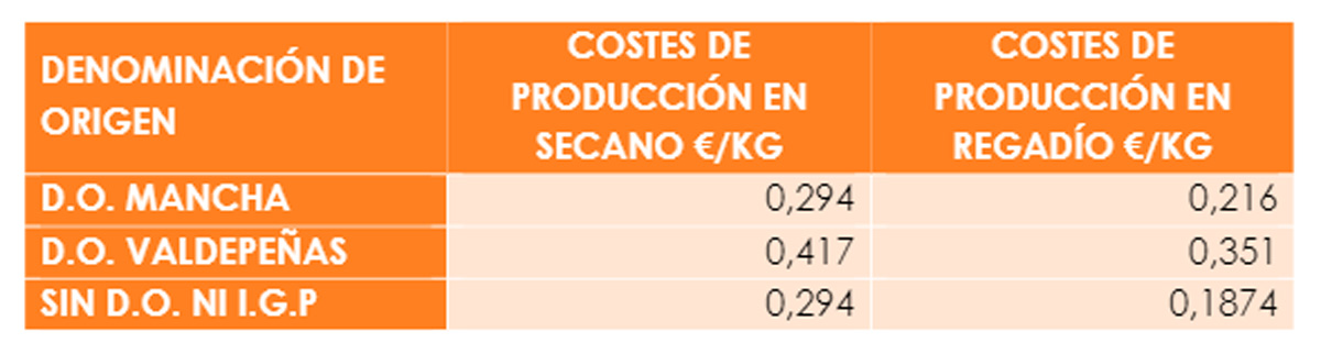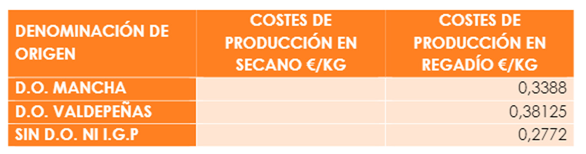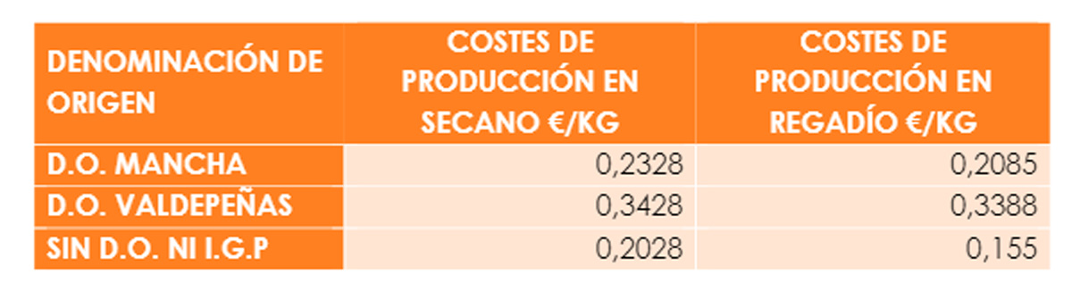 En cuanto a la variedad blanca Airén los costes de producción son, en secano, de 0,2328 euros/kilogrado en la Denominación de Origen La Mancha; 0,3428 en DO Valdepeñas y 0,2028 sin DO ni IGP. En regadío se elevan a 0,2085 en Mancha, 0,3388 en Valdepeñas y 0,155 sin DO ni IGP.