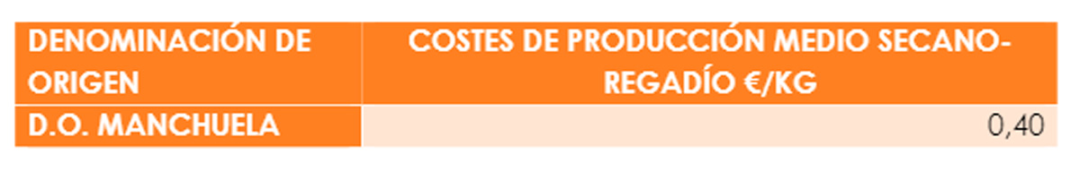 En cuanto a la variedad blanca Airén los costes de producción son, en secano, de 0,2328 euros/kilogrado en la Denominación de Origen La Mancha; 0,3428 en DO Valdepeñas y 0,2028 sin DO ni IGP. En regadío se elevan a 0,2085 en Mancha, 0,3388 en Valdepeñas y 0,155 sin DO ni IGP.