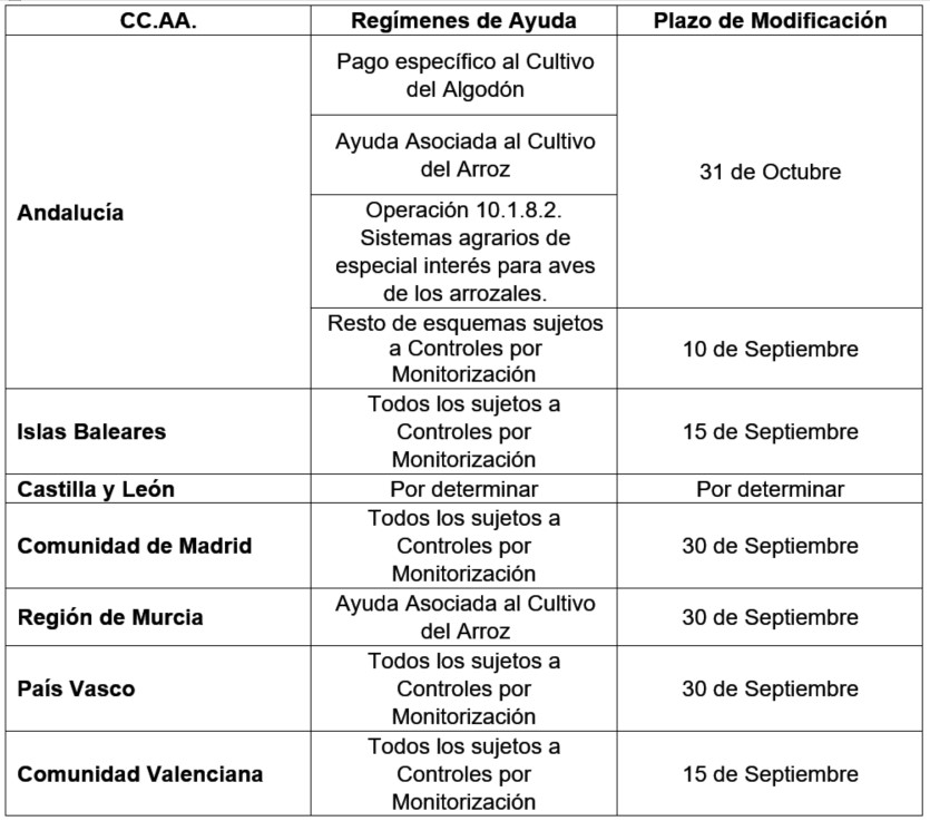 No obstante, estos plazos podrán ser modificados por las comunidades autónomas en su ámbito territorial de actuación, previa comunicación al FEGA y de manera debidamente motivada. De hecho, varias de ellas se han acogido a esta posibilidad y han alargado el calendario.