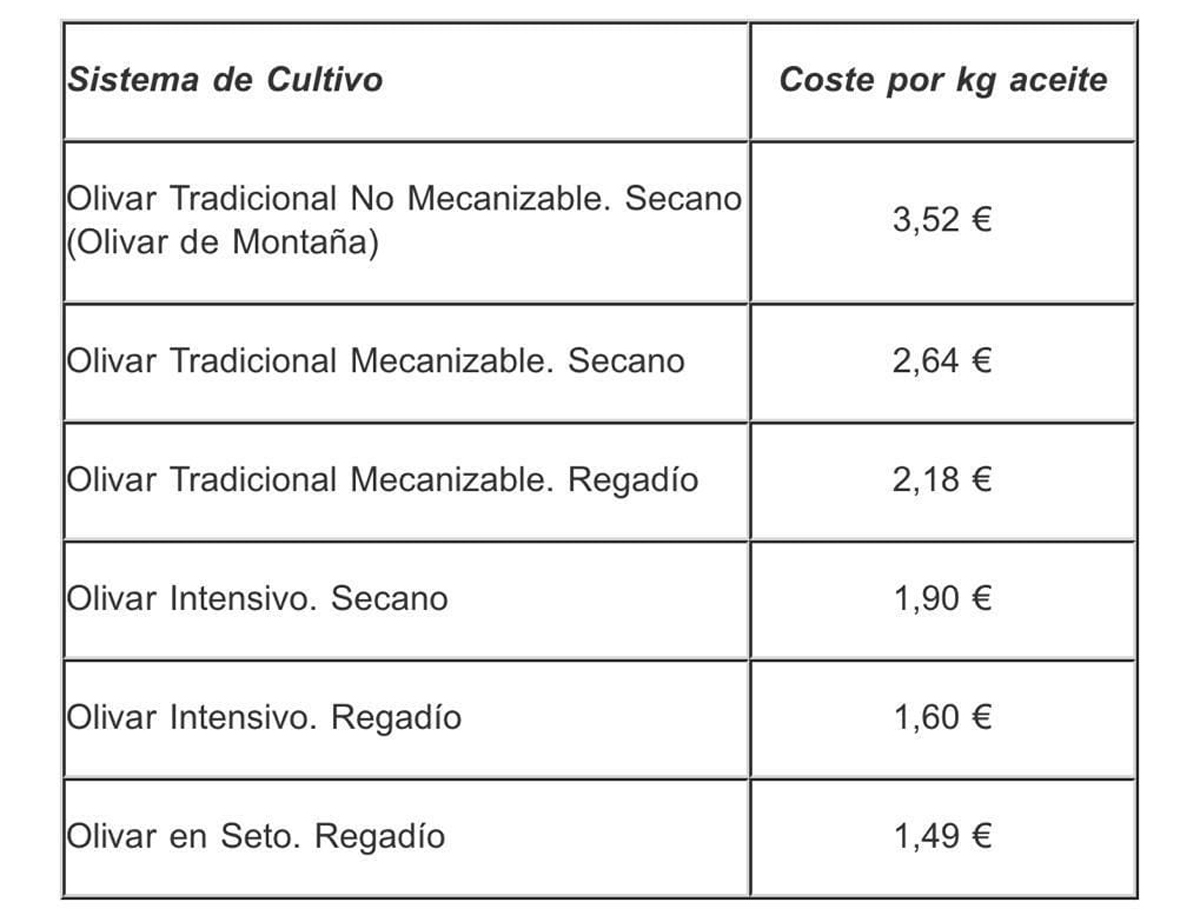 Considerando la distribución de la superficie del olivar español en cada tipología resulta que, de media, producir un kilo de aceite de oliva en España tiene un coste de 2.49 euros. Pero este dato es de poca relevancia porque en realidad la variabilidad es muy grande, yendo desde 3.52 € en un olivar de montaña (O.T.N.M) hasta 1.49 € en un olivar en seto de regadío (O.S).