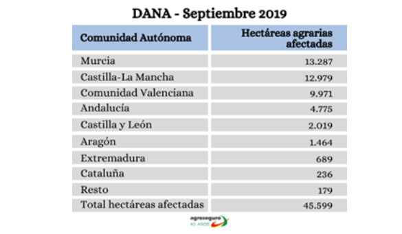La superficie afectada a nivel nacional alcanzó las 45.600 hectáreas, repartidas a lo largo de 41 provincias y 15 comunidades autónomas, aunque tres de ellas (Región de Murcia, Comunidad Valenciana y Castilla-La Mancha) acumularon el 80% de los daños. En las semanas posteriores a la tormenta, Agroseguro recibió 5.563 declaraciones de siniestro en total.