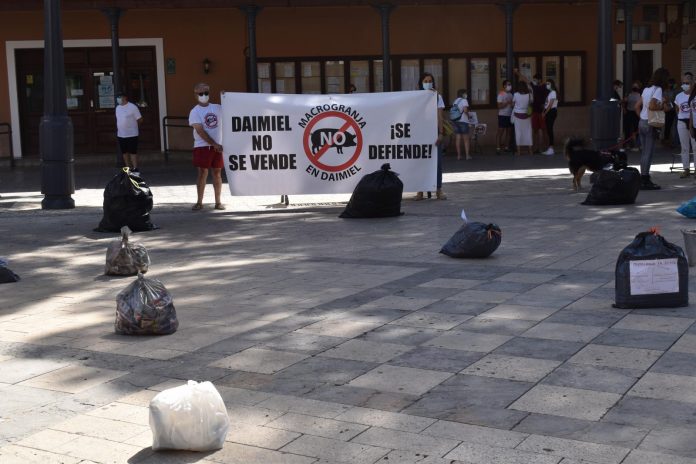 Alrededor de 150 bolsas de basura se dispusieron en el suelo de la Plaza de España de Daimiel (Ciudad Real) durante el domingo como forma de protesta simbólica contra la instalación de una macrogranja porcina en la localidad. Todas ellas mostraron mensajes reivindicativos con los que la plataforma ciudadana ‘STOP Macrogranjas Daimiel’ quiso mostrar su disconformidad respecto al emplazamiento de este tipo de industria en la localidad. Además, se instaló una mesa en la puerta del Ayuntamiento para la recogida de firmas en contra del proyecto.
