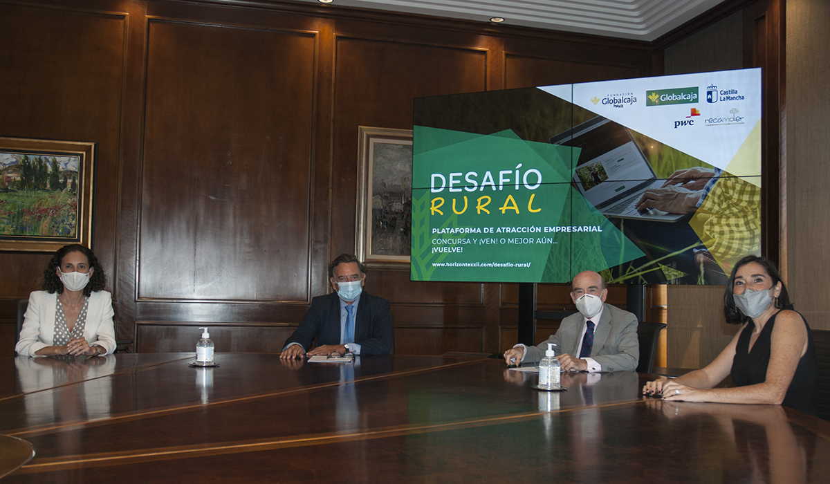 Los presidentes de la Fundación Globalcaja HXXII y de la Fundación PwC, Rafael Torres Ugena y Santiago Barrenechea, respectivamente, han suscrito un acuerdo marco para expresar su colaboración en el programa Desafío Rural, la plataforma de atracción empresarial que, con la forma de concurso, quiere fomentar la implantación de empresas en municipios rurales de Castilla-La Mancha. Les han acompañado en el acto las directoras generales de ambas fundaciones, Carla Avilés y Marta Colomina.