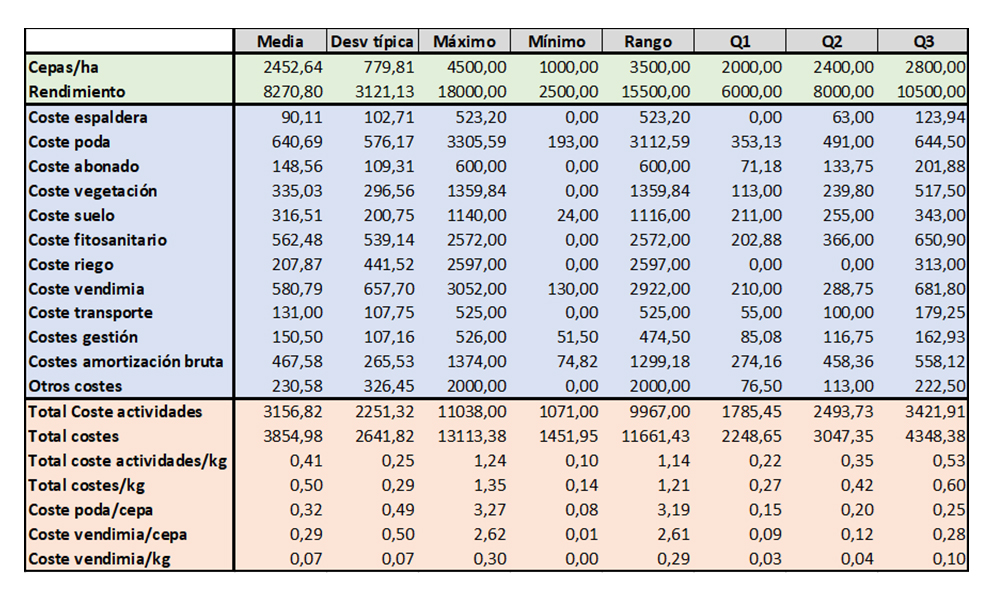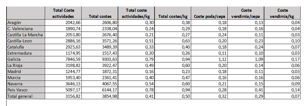 Según este estudio, el coste medio de producción en España se cifra en 50 céntimos por kilo de uva, aunque asciende a los 60 céntimos en Navarra y la Rioja y a los 63 céntimos en Castilla y León. Este estudio no tiene en cuenta las condiciones especiales derivadas de los protocolos de seguridad anti COVID que se han puesto en marcha de cara a la vendimia en todas las zonas productoras y que han supuesto un incremento considerable de los costes para el productor (empleo de Epis, cuadrillas burbuja, incremento de vehículos para el transporte tanto de trabajadores como del producto, etc.).