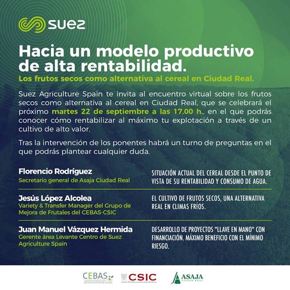 Suez Agriculture Spain invita a todos los interesados al encuentro virtual sobre los frutos secos como alternativa al cereal en Ciudad Real, que se celebrará el martes 22 de septiembre a las 17.00 horas, en el que se podrá conocer cómo rentabilizar al máximo la explotación a través de un cultivo de alto valor. Los interesados deben inscribirse en: https://event.webinarjam.com/register/1/l8m33iy