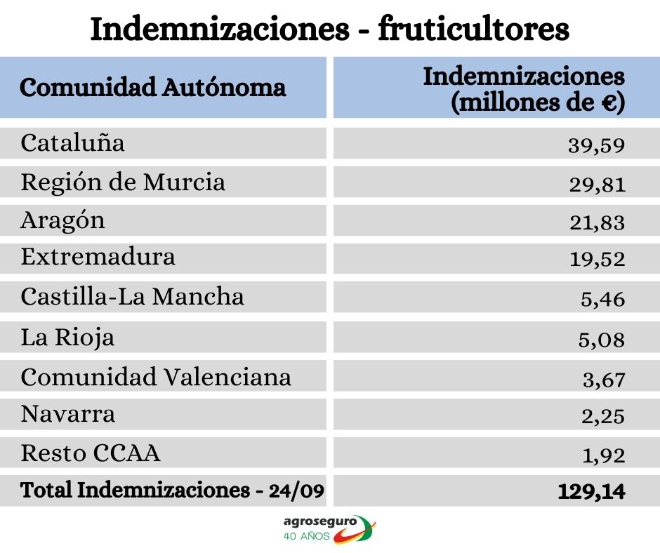 La comunidad autónoma de Cataluña es la que más daños aglutina en fruta, con indemnizaciones de 39,59 millones de euros, de los cuales más de 29 vienen provocados por los reiterados pedriscos de la primavera y el verano. El melocotón (con casi 31 millones) es el cultivo más afectado.