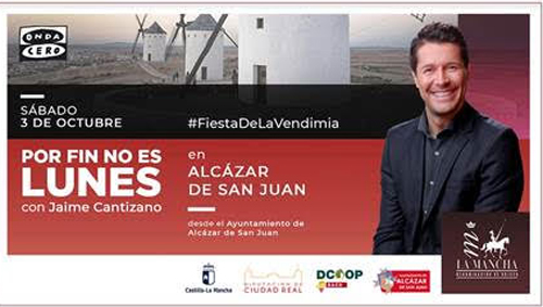 El programa de fin de semana de Onda Cero ‘Por fin no es lunes’ se emitirá este sábado desde el Ayuntamiento de Alcázar de San Juan, donde Jaime Cantizano entrevistará a su alcaldesa, Rosa Melchor, y al presidente de la Denominación de Origen La Mancha, Carlos David Bonilla. Con ellos profundizará en las particularidades de una de las zonas vitivinícolas más importantes del mundo.