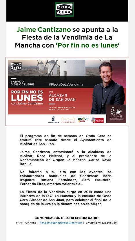 Con motivo de la celebración de la II Fiesta de la Vendimia, Onda Cero se traslada a La Mancha, desde algunos de cuyos lugares más vinculados al vino se emitirán sus principales programas.
