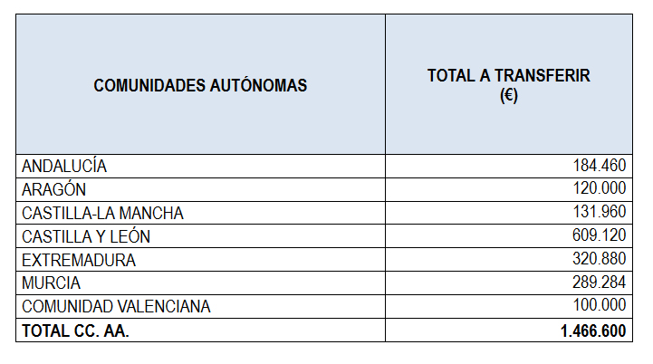 El reparto se ha llevado a cabo en consonancia con las comunicaciones efectuadas por las autoridades competentes de las comunidades autónomas con respecto a sus previsiones sobre las peticiones realizadas por los beneficiarios. La dotación presupuestaria prevista para la línea en este ejercicio es de 10 millones de euros.