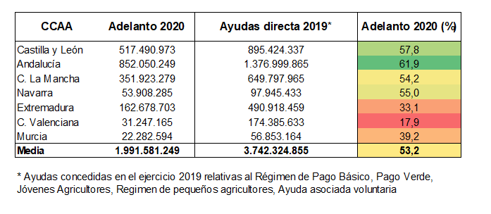 El MAPA estima también en su comunicado que, uniéndose al anticipo el resto de CCAA, se adelantarán 3.420 millones de los 4.954 millones previstos para la campaña 2020, lo que supondría un adelanto del 69% de los fondos. Sin embargo, no se ofrecen datos desagregados para ninguna CCAA de las cantidades totales previstas de pagos directos.