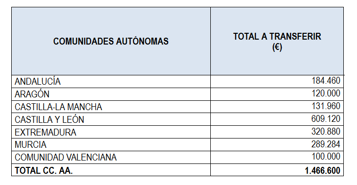 El reparto se ha llevado a cabo en consonancia con las comunicaciones efectuadas por las autoridades competentes de las comunidades autónomas con respecto a sus previsiones sobre las peticiones realizadas por los beneficiarios. La dotación presupuestaria prevista para la línea en este ejercicio es de 10 millones de euros.