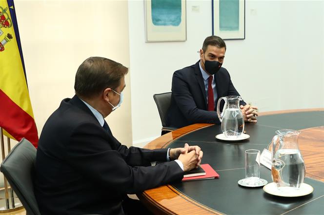 El presidente del Gobierno, Pedro Sánchez, acompañado del ministro de Agricultura, Pesca y Alimentación, Luis Planas, se ha reunido este miércoles en La Moncloa con las organizaciones agrarias ASAJA y UPA y Cooperativas Agroalimentarias para analizar los principales asuntos de interés del sector agrario, y de forma especial, el resultado del acuerdo alcanzado por el Consejo y el Parlamento Europeo sobre la reforma de la PAC 2021-2027.