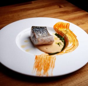 ▶️Corvina, crema de alubias y pimiento y sopa de rúcula. Riquísimo.