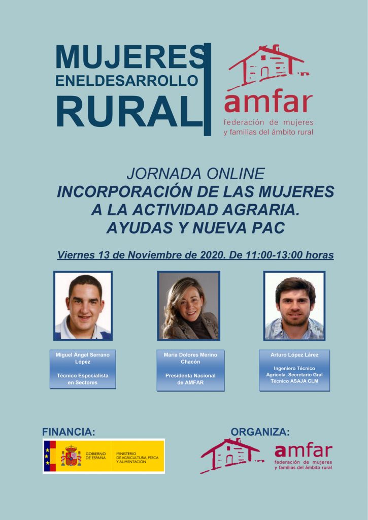 La Federación de Mujeres y Familias del Ámbito Rural (AMFAR), informará mañana viernes, 13 de noviembre, sobre las ayudas a la que pueden optar las mujeres que se incorporen a la actividad agraria y sobre la nueva PAC, en una jornada telemática que tendrá lugar de 11 a 13 horas, a través de la plataforma zoom.