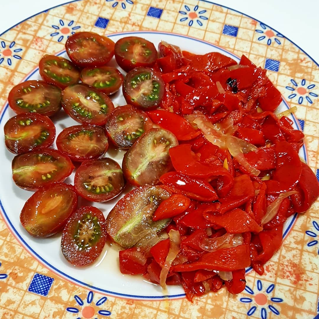 ▶️Picadillo de tomate + pimientos asados con cebolla.