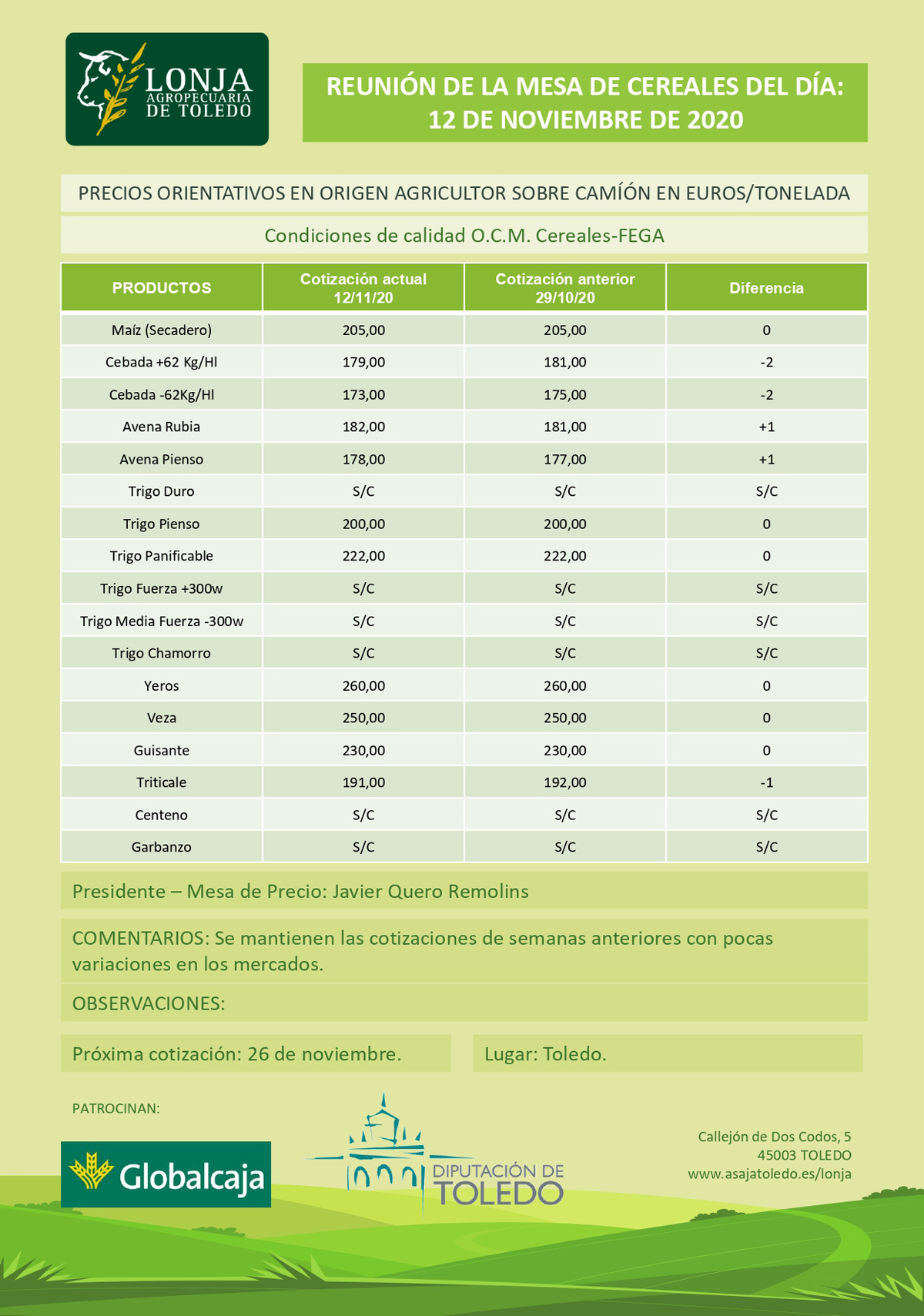Lonja Agropecuaria de Toledo. Mesa de Cereales. 12-noviembre-2020