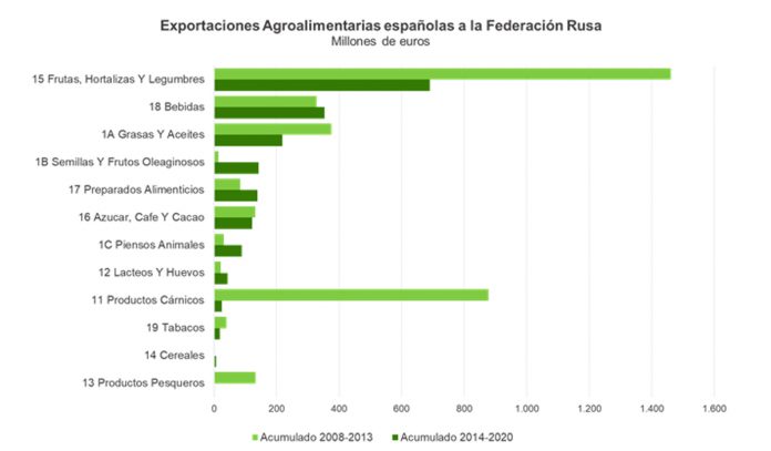 En este sentido, los sectores más afectados por el cierre de fronteras habrían sido los productos cárnicos y las frutas y hortalizas, que habrían dejado de percibir 850 y 770 millones de euros respectivamente, lo que implicaría unas caídas del 97% y del 53% del valor de las exportaciones en el periodo 2014-2020 respecto al periodo 2008-2013.