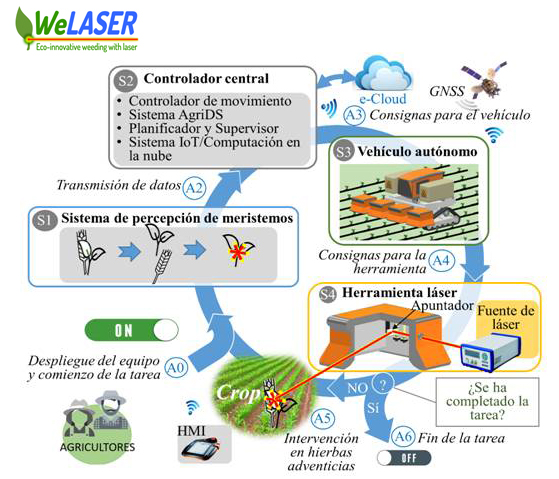 En un contexto de creciente población mundial y necesidad de reducción del uso de pesticidas y fertilizantes, WeLASER busca su sustitución. Las soluciones mecánicas contribuyen a deteriorar las propiedades del suelo, dañan sus organismos beneficiosos y proporcionan malos resultados para la eliminación de malas hierbas. Sin embargo, la solución WeLASER se enfoca en el manejo no químico de hierbas no deseadas basado en la aplicación de dosis letales de energía en los meristemos de dichas hierbas utilizando una fuente láser de alta potencia. Un sistema de visión de Inteligencia Artificial discrimina los cultivos de las hierbas adventicias y detecta la posición de sus meristemos para apuntar con el láser sobre ellos, utilizando un escáner láser.