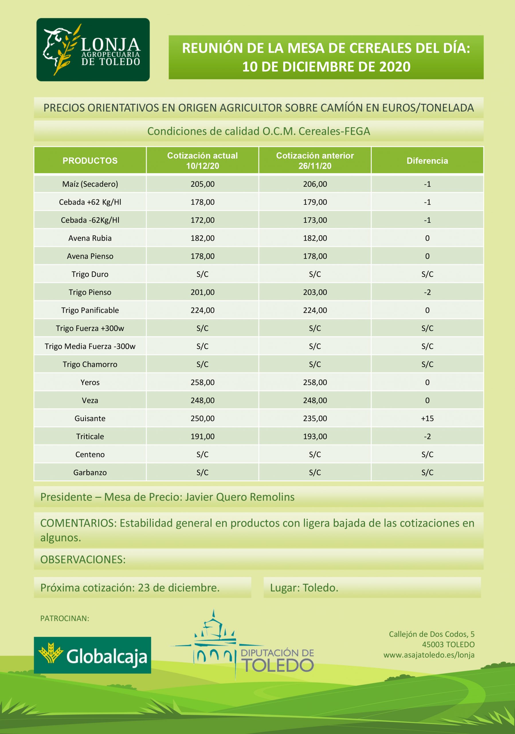 Lonja Agropecuaria de Toledo. Cereales. 10-diciembre-2020