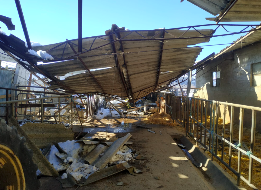 Por su lado, los ganaderos han sufrido el derrumbe de naves enteras y voladizos por el peso de la nieve, en algunos casos, atrapando a animales en su interior. Además, los ganaderos y ganaderas de leche ya no tienen capacidad de almacenaje. Ya se han tirado más de 10.000 litros y algunos productores esperan que los camiones cisterna todavía tardes unos días más en poder acceder a sus instalaciones. También hay muchos animales que no están pudiendo recibir sus raciones completas porque los ganaderos no están pudiendo acceder a sus explotaciones o tienen que racionar la comida en previsión que esto dure más tiempo.