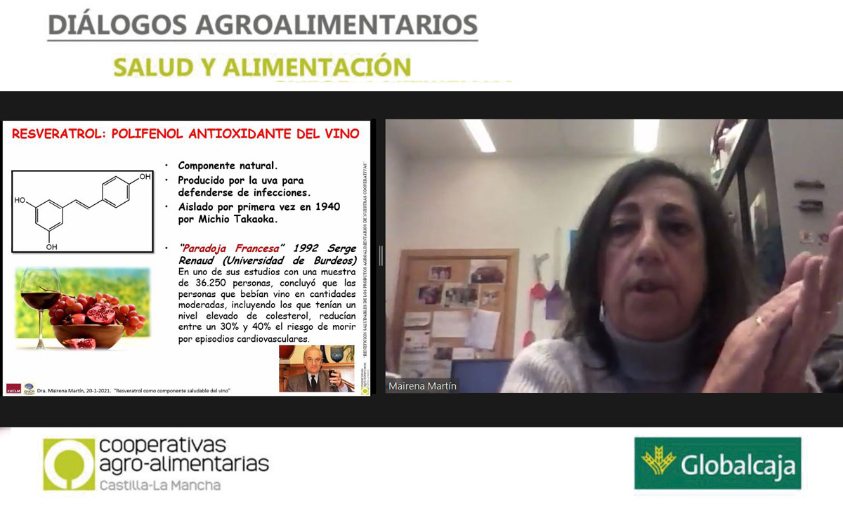 El resveratrol, molécula presente en el vino entre otros alimentos, protege frente al envejecimiento celular, según explicó Mairena Martín, asesora científica de la Fundación para la Investigación del Vino y la Nutrición (FIVIN) en el webinar “Salud y Alimentación”. El encuentro digital tuvo lugar dentro de los Diálogos Agroalimentarios que organiza periódicamente Cooperativas Agroalimentarias de Castilla–La Mancha, en colaboración con Globalcaja. Durante el seminario se expusieron los beneficios del vino y otros alimentos dentro de la dieta mediterránea y se resaltaron la calidad de los productos agroalimentarios de la región.