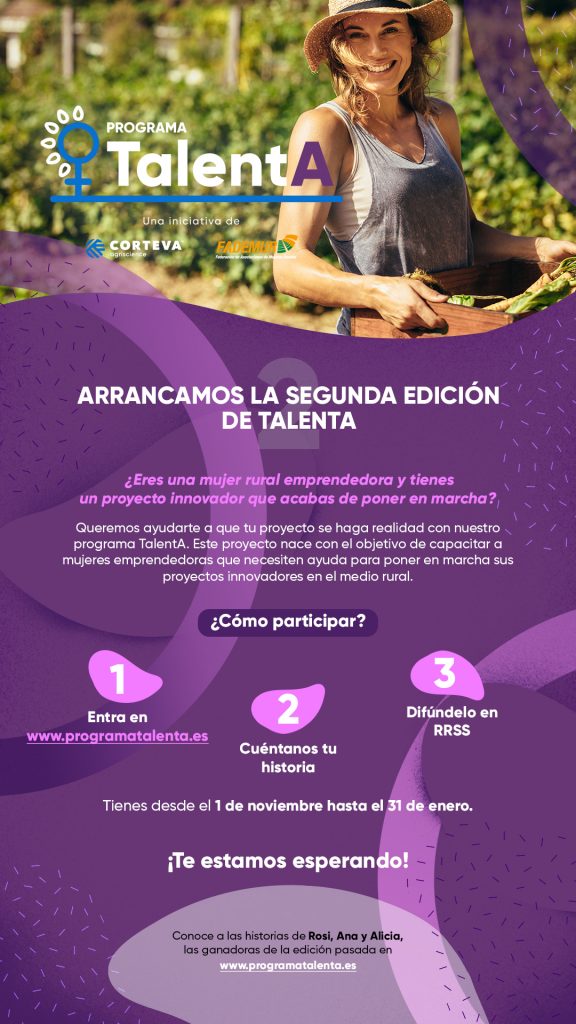 La Federación de Asociaciones de Mujeres Rurales (FADEMUR) y Corteva Agriscience cerrarán el próximo domingo 31 de enero el plazo de recepción de candidaturas a la segunda edición del Programa TalentA, la iniciativa une a ambas entidades con el objetivo de empoderar a las mujeres rurales a través del apoyo a sus proyectos empresariales.