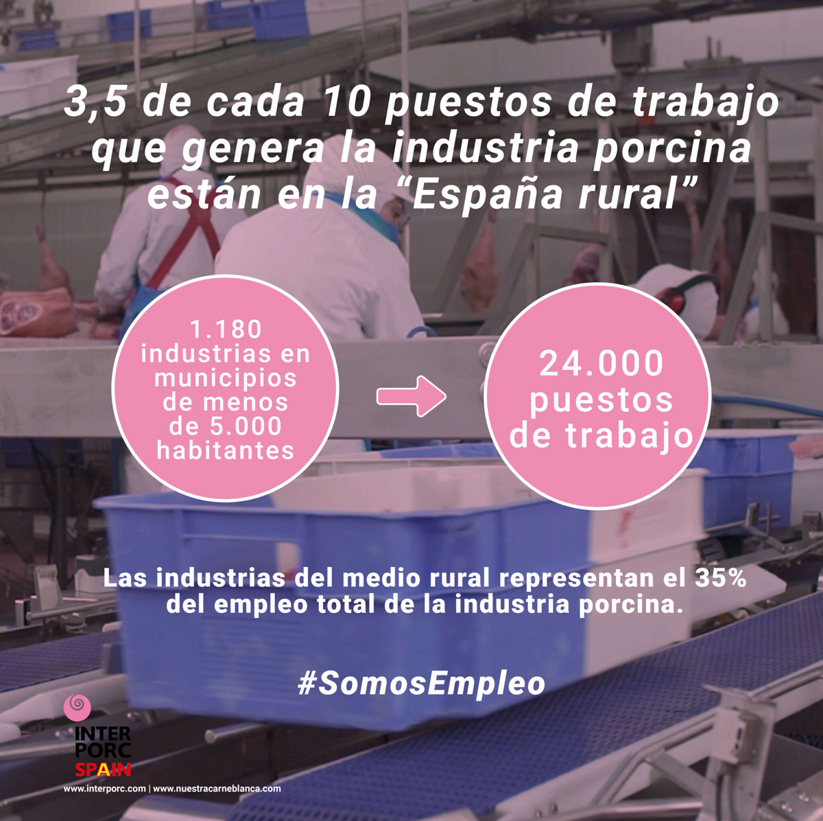 Más de 1.180 industrias de porcino españolas se ubican en municipios de menos de 5.000 habitantes, donde generan más de 24.000 empleos directos, lo que supone el 35% del empleo total de la industria porcina, según los datos elaborados por la Interprofesional del Porcino de Capa Blanca (INTERPORC).