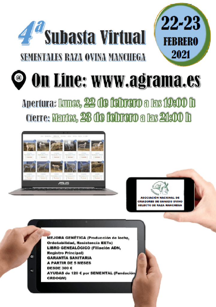 Los días 22 y 23 de febrero tendrá lugar la IV Subasta Virtual de Sementales de Raza Ovina Manchega, la primera del año 2021. De la misma forma que se ha hecho desde la Declaración del Estado de Alarma frente a la crisis sanitaria (COVID-19), y ante las restricciones y recomendaciones establecidas, la Asociación Nacional de Criadores de Ganado Ovino Selecto de Raza Manchega (AGRAMA) ha previsto continuar con la organización, a través de su plataforma virtual, de esta forma de Oferta/Venta pública como parte del Programa de Difusión de la Mejora.