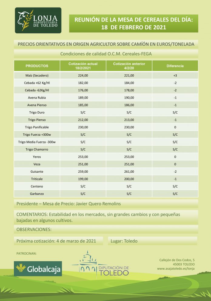 Lonja Agropecuaria de Toledo. Cereales. 18-febrero-2021