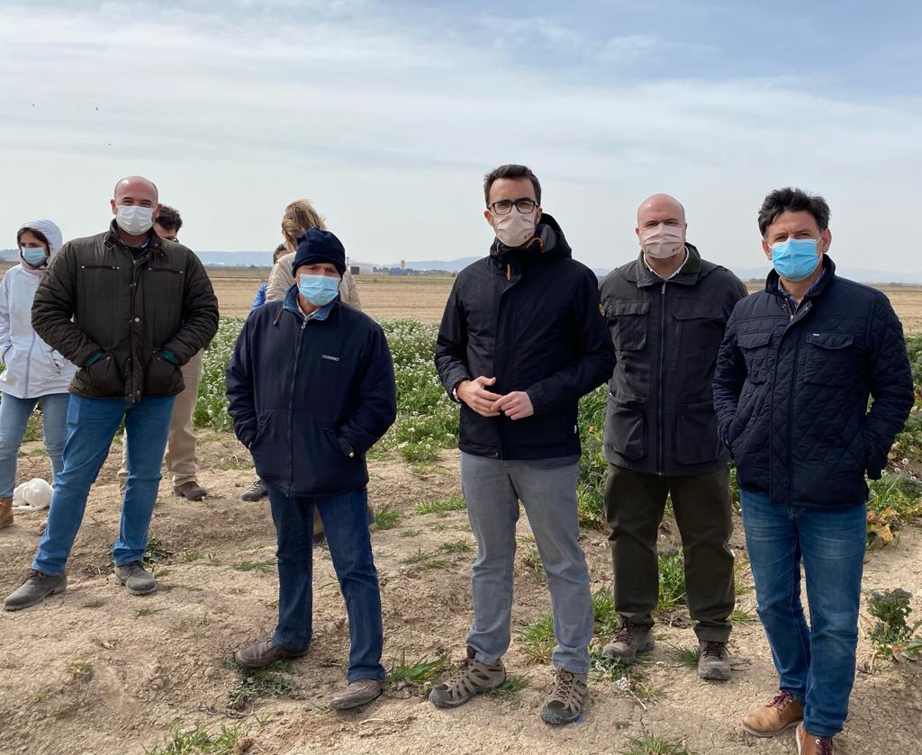 El secretario general de UPA Castilla-La Mancha, Julián Morcillo, junto a la Secretaria de Organización de la organización agraria en Toledo, María Sánchez, y la técnica en Tomelloso, Cristina Monreal, acompañados de varios agricultores afectados, han visitado parcelas damnificadas de las localidades de Alcázar de San Juan (Ciudad Real) y Villafranca de los Caballeros (Toledo). La visita, promovida por UPA, ha contado con la presencia del director general de Medio Natural, Félix Romero; el delegado de Desarrollo Sostenible de Ciudad Real, Fausto Marín, y los concejales de Agricultura de Alcázar de San Juan, Villafranca de los Caballeros, Herencia y Quero.
