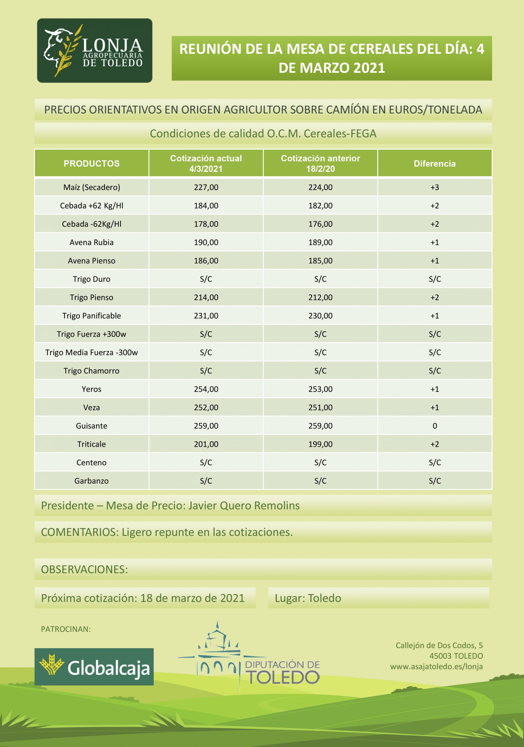 Lonja Agropecuaria de Toledo. Cereales. 4-marzo-2021