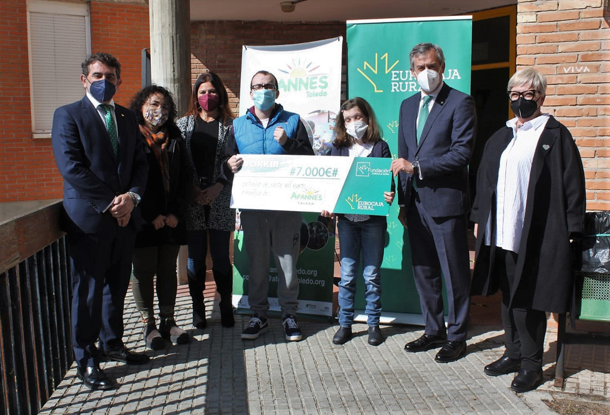 El presidente de la Fundación Eurocaja Rural, Javier López Martín, acompañado del director de Relaciones Institucionales de Eurocaja Rural, Miguel Ángel Escalante Pinel, y la gerente de la Fundación Eurocaja Rural, Susana Cortés Martínez, ha entregado a la presidenta de AFANNES Toledo, Carolina Cabañas Cabañas, acompañada de la tesorera de la asociación, Sagrario Bravo, y de dos personas con discapacidad intelectual, uno de los diez premios WORKIN.