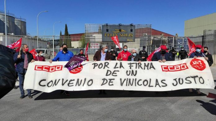 Bajo el lema “Por la firma de un convenio de Vinícolas digno”, los trabajadores -cumpliendo en todo momento con las medidas de seguridad- han recorrido más de tres kilómetros, desde la Puerta del Vino hasta las bodegas de Félix Solís, líder patronal en la mesa de negociación del convenio provincial del sector.