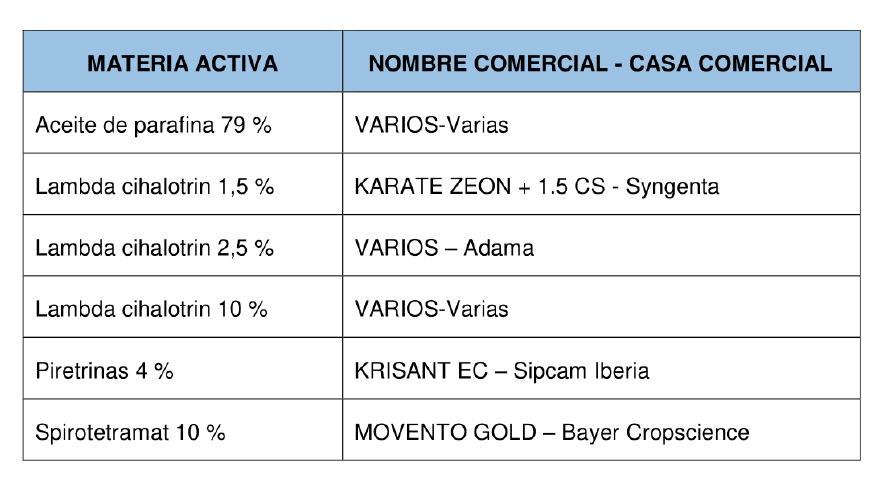 Actualmente, las materias activas autorizadas en el Registro de Productos Fitosanitarios del Ministerio de Agricultura, Pesca y Alimentación para el control de esta plaga son las que a continuación se detallan: