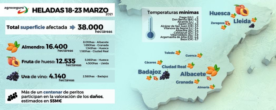 El impacto de las heladas, además, se ha extendido a las provincias andaluzas de Granada y Almería, donde los daños en almendro alcanzan las 1.690 y 500 hectáreas aseguradas, respectivamente.