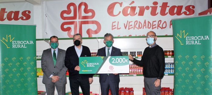 El presidente de la Fundación Eurocaja Rural, Javier López Martín, acompañado del director territorial de Eurocaja Rural en Talavera de la Reina, David López Luna, hizo entrega del reconocimiento al director de Cáritas en Talavera de la Reina, Ricardo Riesco, quien acudió con el sacerdote delegado de Cáritas en Talavera de la Reina, Vicente Domínguez.