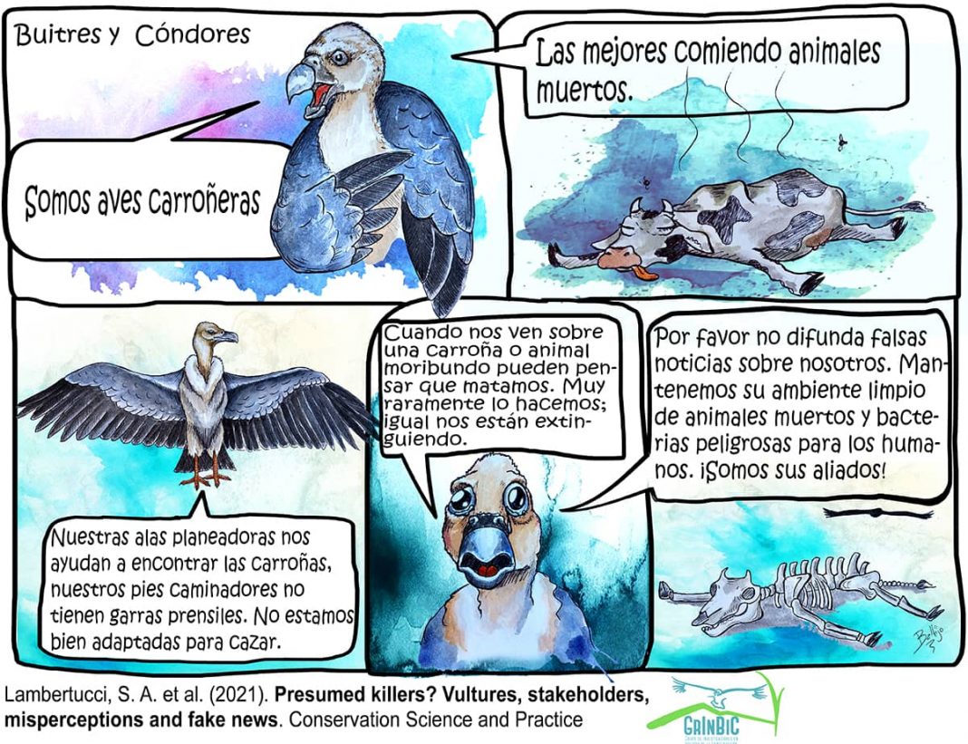 Las representaciones de buitres y cóndores atacando a personas fueron comunes hace un siglo, e incluso llegaron a ser parte de libros famosos. Actualmente, las “fake news” y las imágenes y vídeos sacados de contexto contribuyen a la percepción social negativa hacia los buitres en todo el mundo, llegando a ser contemplados como “aves asesinas de ganado”. En realidad, el número real de casos en los que se detecta la ingesta de un animal aún vivo por parte de los buitres, casos que siempre se asocian a animales no supervisados con un diagnóstico vital muy desfavorable, es extremadamente bajo, y los buitres nunca son identificados como la causa primaria de su muerte.
