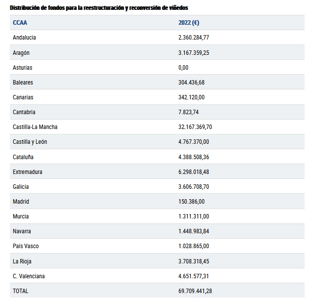 Para los criterios de distribución de los fondos de reestructuración y reconversión se ha tenido en cuenta en primer lugar la superficie de viñedo de cada comunidad autónoma, que supone el 65 % del total. El 14 % se reparte en función de la inversa del valor de la producción; otro 14 % corresponde a la producción de vino con Indicación Geográfica; el 5 % para las zonas consideradas como “regiones menos desarrolladas”; y el 2 % restante para contemplar las especificidades de las Islas Baleares y Canarias y de Galicia.