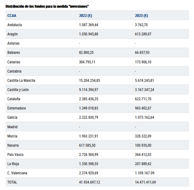 Por un lado, se ha autorizado la distribución de 69.709.441 euros entre las comunidades autónomas para la medida de reestructuración y reconversión de viñedos, correspondiente al ejercicio 2022, así como la lista definitiva de solicitudes de ayudas a la medida de inversiones por 56,4 millones de euros, de los que 41,9 millones de euros se corresponden al 2022 y 14,5 millones de euros al año 2023.