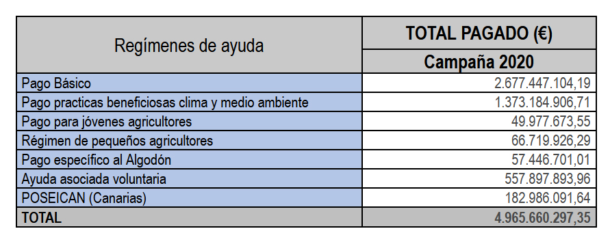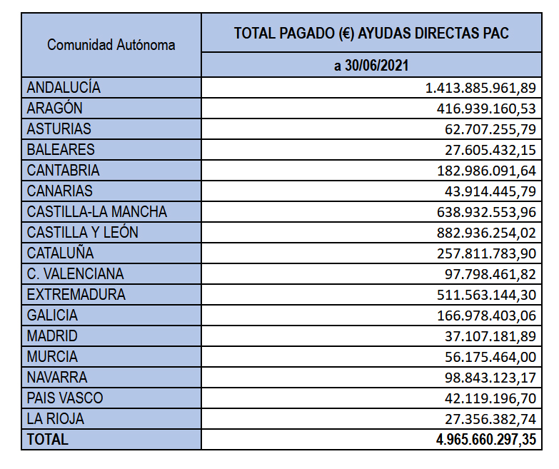 En relación con las ayudas directas de la PAC de la campaña 2020, hasta el pasado 30 de junio se habían abonado un total de 4.965 millones de euros. El ejercicio de pago de las ayudas de la PAC computa cada año los pagos realizados desde el 16 de octubre del año al que se refieren los pagos hasta el 15 de octubre del año siguiente. El Fondo Español de Garantía Agraria (FEGA), que publica de manera periódica (en su página web) los informes de seguimiento de dichos pagos, ha publicado recientemente el correspondiente a los pagos realizados hasta el pasado 30 de junio.