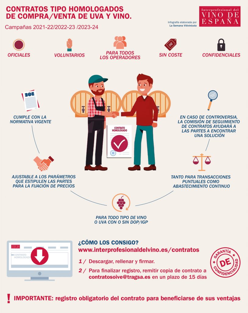 La Organización Interprofesional del vino de España pone a disposición de todos los operadores para las tres próximas campañas por un lado, el contrato tipo homologado de compraventa de uva con destino a su transformación en vino y, por otro, el contrato tipo homologado de vino.