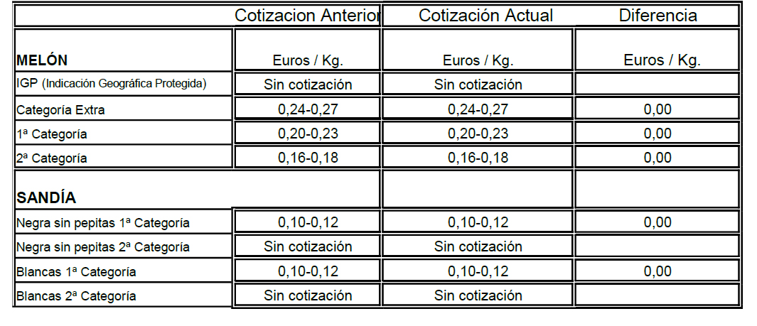 Los precios han repetido cotizaciones, situándose por abajo en los 10 céntimos/kilo de la sandía y por arriba en los 27 del melón de categoría extra. De momento, hay varias categorías que aún no cotizan.