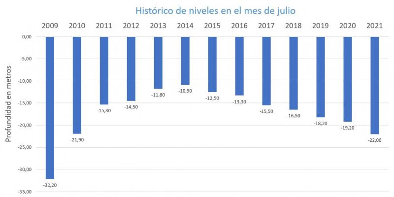 Con respecto a hace un año (-19,20) la bajada del nivel es de casi tres metros, y lo más preocupante, es la tendencia de los últimos siete años. En 2014 se frenó la recuperación del acuífero y desde entonces, año tras año, se extrae más agua de la que entra en el sistema, indican.