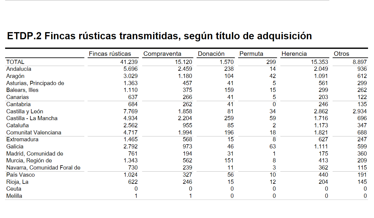 En total se transmitieron 41.239 fincas rústicas en junio, la mayoría heredadas (15.353) y objeto de compraventa (15.120), a las que se sumaron 1.570 donaciones, 299 permutas y 8.897 operaciones catalogadas como «otras».