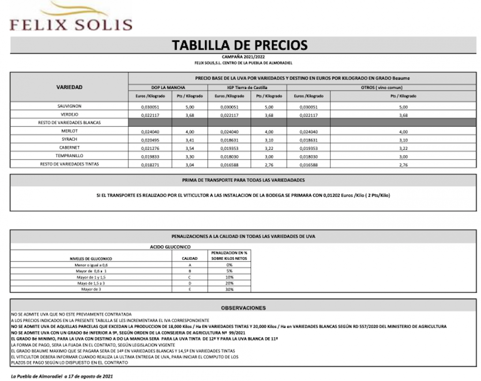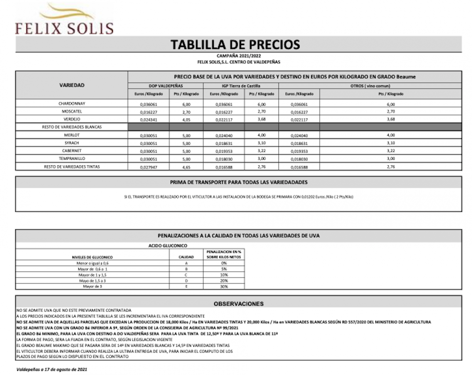 Bodegas Félix Solís ha actualizado sus tablillas de precios de la uva en las denominaciones de origen Mancha y Valdepeñas, aunque la fecha es la misma de la primera tablilla, el 17 de agosto, según ha publicado El Correo del Vino.
