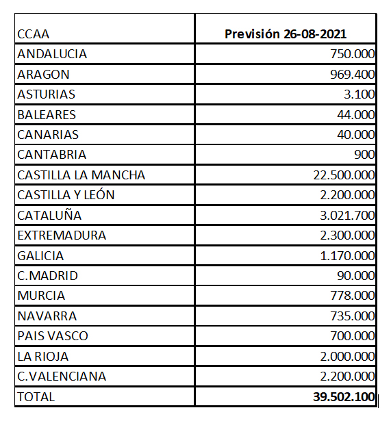 A 26 de agosto la estimación de esta campaña es de 39,5 millones de hectolitros de vino. Se trata de una estimación inicial, ya que dependiendo de la climatología durante el próximo mes estas cifras podrían sufrir alguna oscilación. La cosecha en todo caso será corta, por debajo de la media y 7 millones de hl menor que la campaña 2020-2021 en la que se alcanzaron los 46,5 millones de Hl.