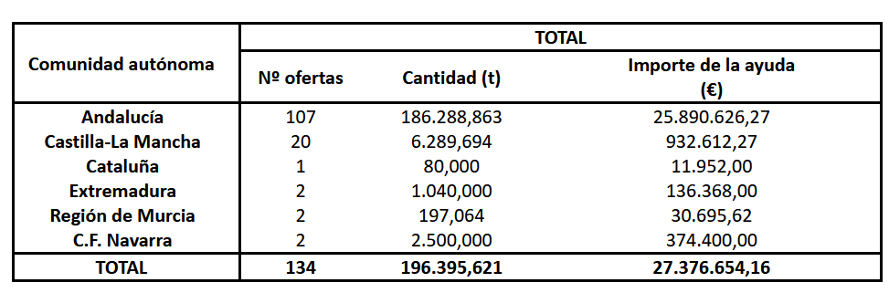 De las categorías de aceite almacenado, la mayor parte (93,57 %), lo fue de aceite lampante, seguido en menor medida por los aceites de oliva virgen y virgen extra. Esta medida contribuyó a retirar aceite de oliva del mercado en una situación delicada, favoreciendo la estabilidad del mercado y la recuperación de precios. A continuación se muestran los datos en función de las ofertas presentadas en cada comunidad autónoma: